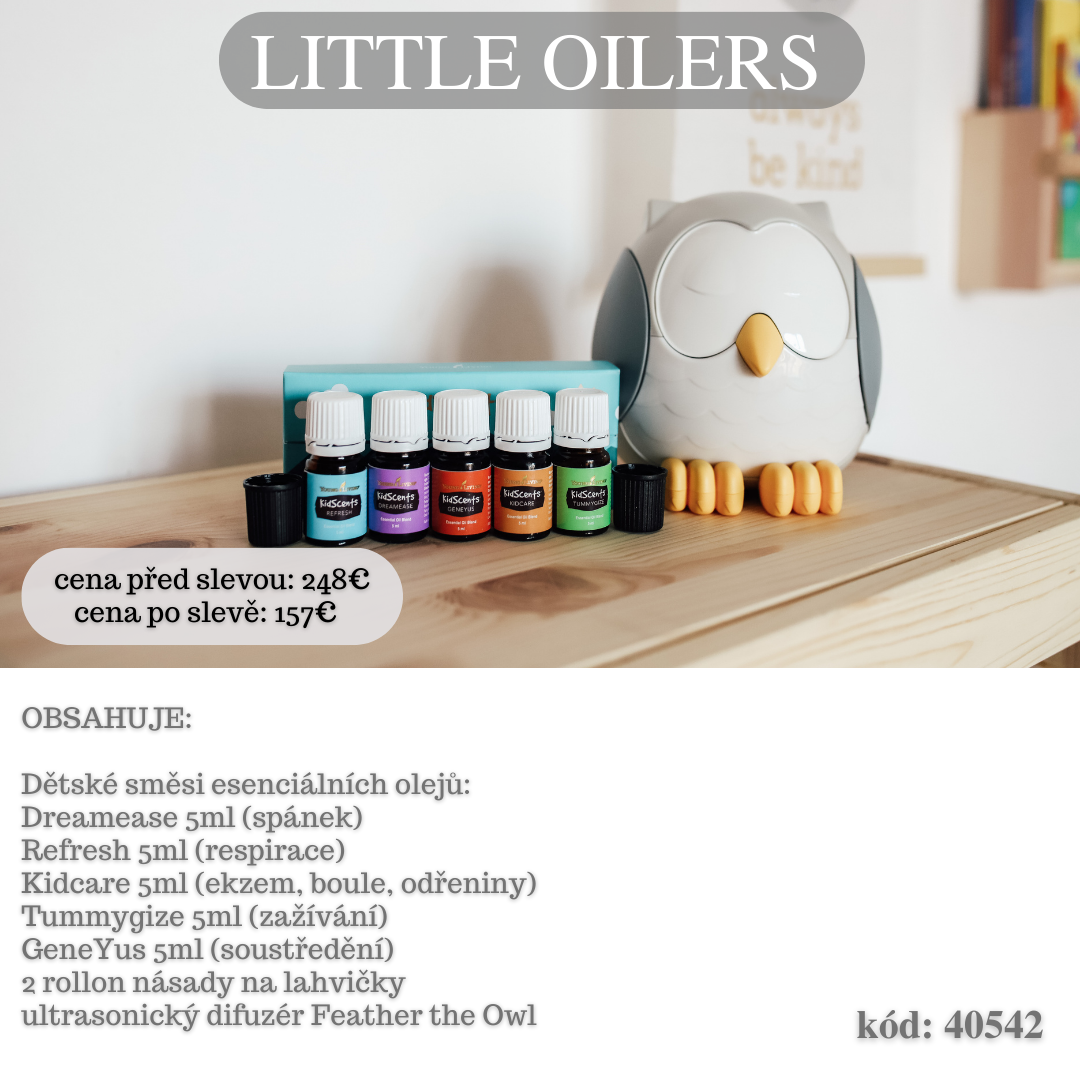 Kolekce 5 směsí esenciálních olejů speciálně vytvořených pro naše nejmenší s difuzérem Sovička.